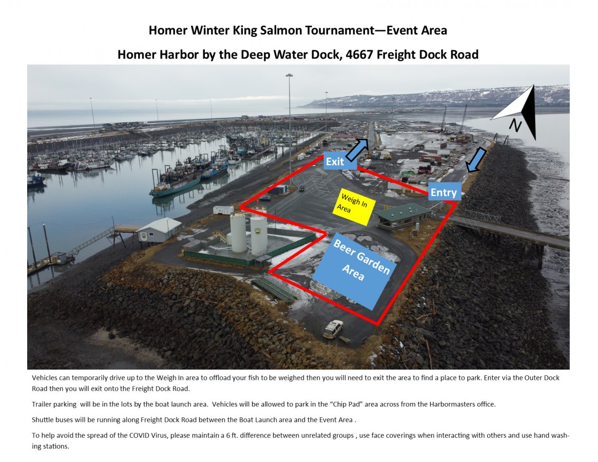 The Event Area is moving this year to an area on the west side of the Harbor called the Deep Water Dock, just south of the Harbormasters Office. Using the Outer Dock Road, you can drive down to the event area to offload your fish to be weighed, then continue on to the parking area. You can view a map of this area using the link on the right side of this page.